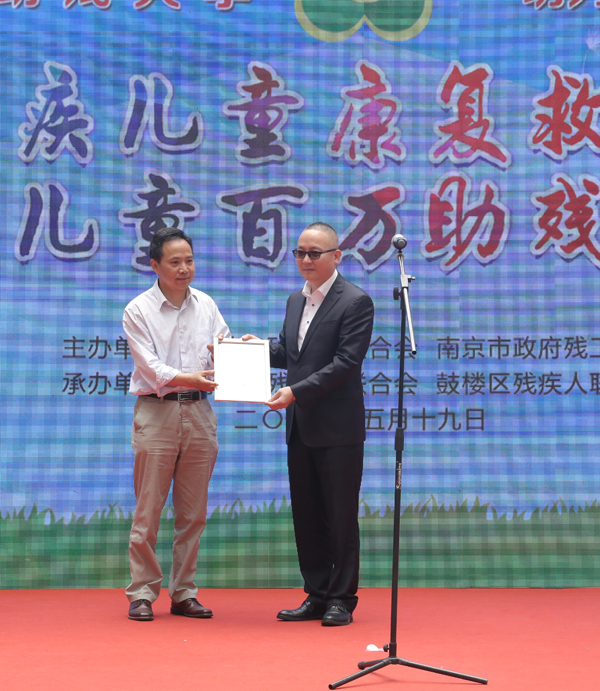 南京市残联副巡视员娄克凡代表市残疾人福利基金会向南京天佑儿童医院颁发捐赠证书